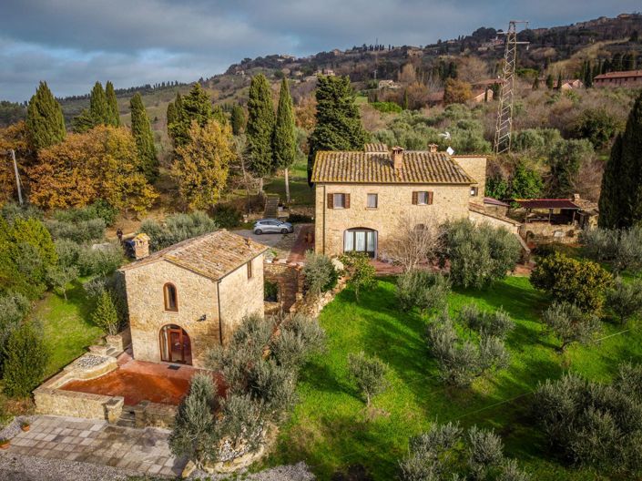 Located in the hills some 3km from the centre of Volterra we offer for sale this well renovated 5 bedroom 5 bathroom farmhouse and barn, with superb panoramic views over the surrounding countryside, sitting in over 1.5 acres of land, some 45 minutes from the sea and 1 hour from Pisa airport. The main farmhouse provides about 300m2 of accommodation over two floors. The entrance to the house is on the ground floor and opens onto the living-room (which in the past was the stable of the Casa Colonica) with typical vaulted ceilings, fireplace and French doors opening onto the garden and giving a continuity between the indoor and outdoor spaces, hallway leading to the kitchen with beamed ceilings, the pantry, laundry room, bathroom, a boxroom and studio (or further bedroom). From the ground floor it is possible to access to the outside loggia with barbecue. Internal stairs lead to the first floor which comprises the master bedroom with en-suite bathroom, 3 further bedrooms, a big bathroom and storage room. All renovations have been done to an extremely high quality and maintaining the original features such as the exposed stones and bricks on the outdoor walls, beamed ceilings, terracotta floors and chestnut windows and doors. Close to the farmhouse there is a 80m2 former barn which was renovated in 2023 and consists of an open-plan living-room with kitchen to view and bathroom on the ground floor, whilst an open staircase leads to the first floor which has a huge bedroom. The barn boasts amazing arched French doors and windows. The sale includes 6500m2 (about 1.606 acres) of land with olive and fruit trees as well as a garden area, all maintained in very good order. The location is ideal as the house is in the countryside but at the same time it is possible to reach Volterra centre and shops in just 5 minutes.