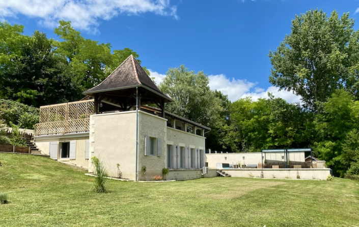 A luxury house deliberately built in a traditional style, there is a tower and balcony overlooking the River Dronne. Several terraces to enjoy the microclimate of this region. A jetty so you can easily access the river with your canoe, kayak or boat. The house has air conditioning so its suitable for all year living, for renting out or for your holidays. It is situated between St Aulaye and Aubeterre, in a quiet area. A contemporary style detached house ready to move into and enjoy, the fixtures and fittings are of a high standard. The house has five bedrooms, four bathrooms, fitted kitchen lounge with wood burner, balcony overlooking the heated pool and river. The garden is 2000m2 with lawn and river frontage. A fisherman’s paradise. There is a garage.