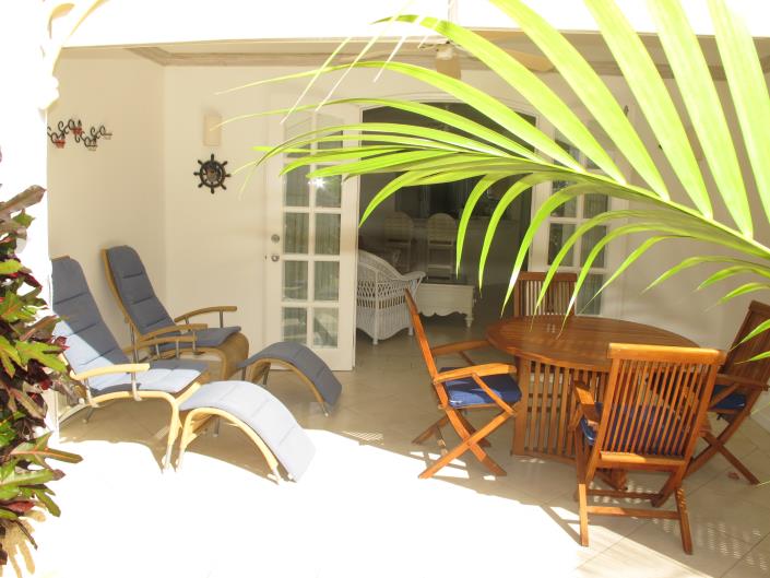 The bedroom, spacious and elegantly furnished, is complemented by a luxurious, marble-tiled bathroom, enhancing the sense of exclusivity. Additionally, the living room accommodates a double sofa bed, expanding the living space's versatility. Residents are offered a choice of air-conditioning, ceiling fans, or the natural cooling breeze of the trade winds, ensuring year-round comfort.
