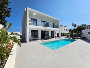 The custom metal-framed staircase with wooden steps leads to the first floor, which houses three double bedrooms. The standout master suite offers direct access to a private terrace with views of the pool and mountains, a stylish en-suite bathroom with a bathtub and walk-in shower, and a generously sized walk-in closet that could easily be converted into a fifth bedroom if needed. The second bedroom also features an en-suite bathroom with a walk-in shower, while the third bedroom shares a separate shower bathroom. Both bedrooms have sea views.