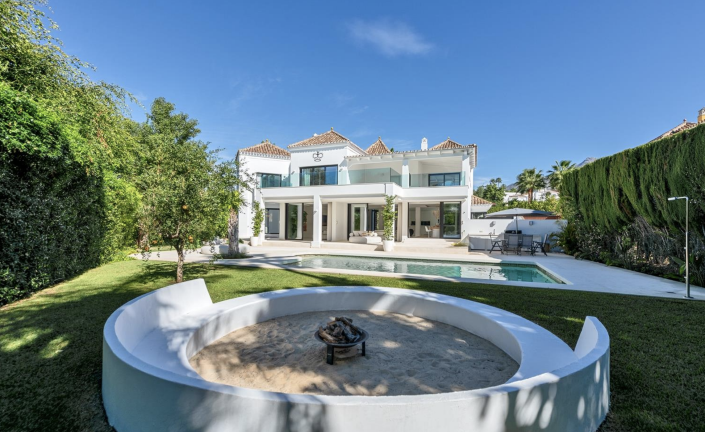Absolutely stunning detached villa located within a sought after gated community in the center of Nueva Andalucia, Marbella. This newly refurbished luxurious four bedroom home is nestled right in the very heart the most exclusive location, adjacent to Royal Las Brisas Golf Course. Upon entering, you are immediately struck by the generous space and light due to contemporary open plan living. From an extremely elegant fully fitted kitchen one overlooks the large raised dining area and the spacious drawing room with sliding patio doors to the covered terrace with views across the gardens. In addition, on the ground floor there is a guest double bedroom suite with doors to the garden. A modern glass staircase takes you to the first floor, and three double bedroom suites, of which one is a stunning master suite with access to a private terrace and an incredible vaulted wooden ceiling covered terrace. Within the “basement” level is a further reformed space with electricity and water installations, ready to be transformed into a further bedroom suite, cinema room, gym, spa, etc. Outside, the villa has a large saltwater pool, sunken lounge area, and an inviting fireplace, ideal for relaxing afternoons or stylish evening gatherings. The lush gardens and private barbecue area transform outdoor living into a lifestyle.