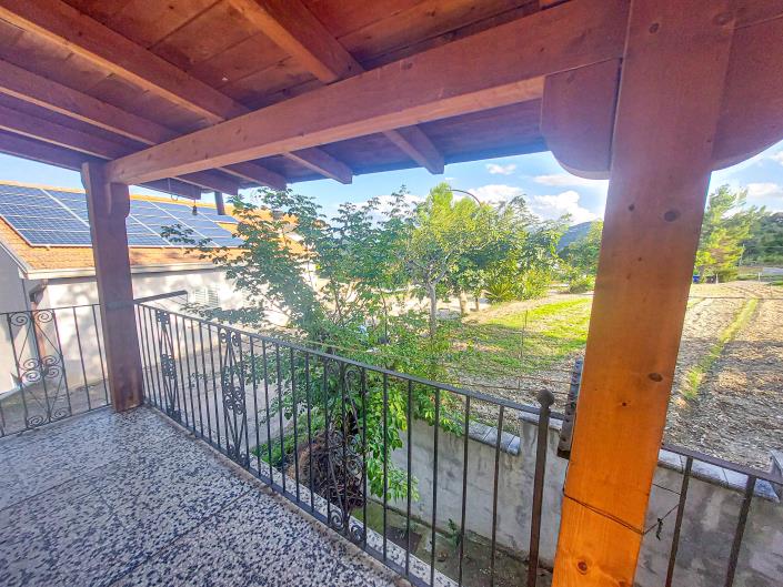 The entrance, enhanced by a wooden canopy, leads directly into a cozy kitchen featuring a fireplace, perfect for creating a warm and welcoming atmosphere. The ground floor also includes a bright living room, ideal for relaxation. Upstairs, the first floor boasts a bedroom and a bathroom, while the second floor opens up to a spacious master bedroom with a renovated wooden roof, exposed beams, and a panoramic balcony offering stunning views of the surrounding countryside