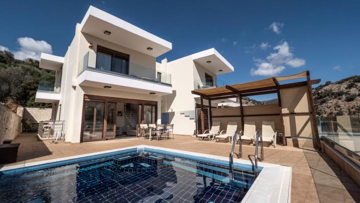The property includes two spacious luxury maisonettes of 200m² each, both with private pools, as well as two additional maisonettes of 85m² each.