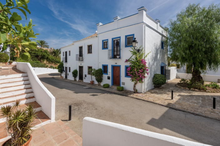 Picturesque townhouse situated within a beautiful Andalusian-style pueblo in the heart of Marbella´s Golf Valley in Nueva Andalucia. This completely unique private and gated community of only 77 properties is located within close proximity to four superb golf courses: La Quinta, Las Brisas, Los Naranjos and Aloha, plus all general amenities including supermarkets, restaurants, cafés, etc are only 1.8km walk away - Puerto Banus Marina and the beach are under 5 minutes drive away too. This well-maintained property is distributed over two levels, with the ground floor comprising of a good-sized lounge/dining room with an open fireplace, fully fitted kitchen, laundry room, and double patio doors leading to a very private dining terrace. Upstairs there is a bright and spacious master bedroom with an en-suite bathroom and a second bedroom, again with en-suite facilities. This exclusive community offers a large communal swimming pool and a tennis court.