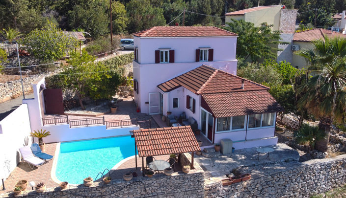 There is spacious accommodation in the main house— plus a self contained guest apartment on the upper floor. The property also has good sized private gardens, a private pool and lovely views across to Souda Bay and the White Mountain range.