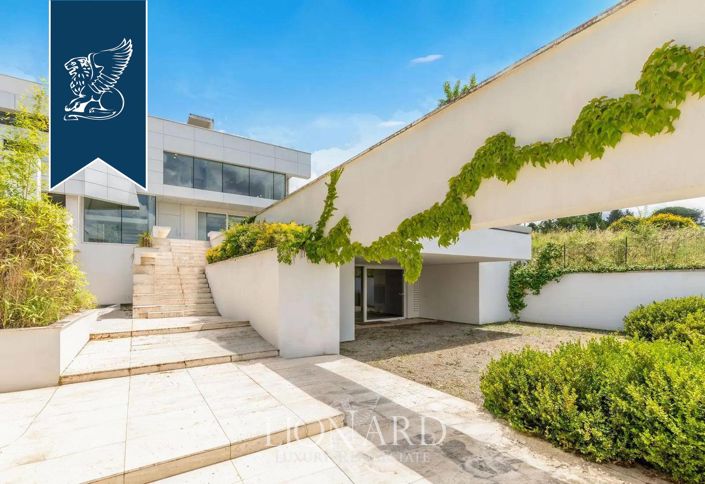 The lower floor hosts a wellness area with a sauna, a cinema room, two spare bedrooms, a bathroom, and a laundry room. The villa is equipped with modern amenities such as a centralized home automation system, underfloor heating, air conditioning in all rooms, and a video surveillance system. The 720-sqm outdoor area features a terraced garden with lighting, outdoor relaxation and dining areas, and a parking space.