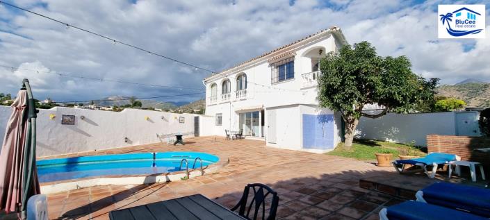 Upstairs to a roof terrace with views of the sea, mountains and Frigiliana.