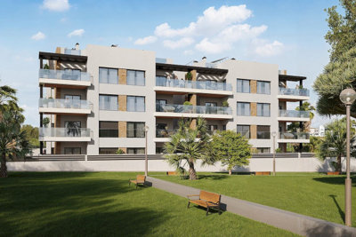 Gomera Star is a new project of modern two bedroom apartments with spacious terraces and excellent location near the sea in the vibrant area of Aguas Nuevas, Torrevieja.