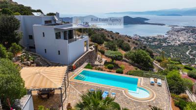 Lasithi Elounda. For sale is a luxurious villa of 243 sqm energy class A + on a plot of 2,048 sqm with a magnificent view of the bay of Elounda. In particular, it offers five comfortably furnished bedrooms with their own bathrooms. On the ground floor there is a single space with a living room with a fireplace, a dining room and a kitchen which is fully equipped and the central terrace with an outdoor dining area. Then there is the main terrace of the villa with the swimming pool which has an overflow and which is 43 square meters, a children's pool, a pergola with an outdoor dining area and a small toilet and then an outdoor area with a unique unobstructed view of the bay of Mirabello and the sea. On the mezzanine floor there are two comfortable bedrooms with their own bathrooms, while on the A floor there is another bedroom with its own bathroom and its own veranda. On the lower level there is the fifth bedroom and then the organized boiler room with storage. The villa also offers a new photovoltaic system of 18 kilowatts for complete autonomy from the consumption of electricity, autonomous heating with electric radiators and air conditioners and the possibility of autonomy with oil heating, with the possibility of automation in all frames and lighting with a smart house system. Also there are four parking spaces, a very large landscaped garden with flowers and shrubs with automatic watering and lighting and a perimeter stone fence maintained by qualified staff.