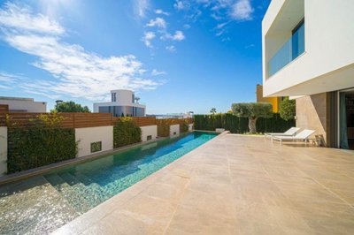 Luxury Villa with Garden in Sierra Cortina. Detached villa located in a prestigious residential area in Finestrat.The property has a built area of 379 m² on a 1,500 m² plot.On the ground floor, there is a spacious living room with direct access to the pool, an open kitchen, and a covered terrace that can be used all year round.On the first floor, the master bedroom features an en-suite bathroom, a walk-in closet, and a private terrace with open sea views. Additionally, there are two more bedrooms with built-in wardrobes, a large terrace, and a bathroom.The basement, with natural light, includes two spacious bedrooms, an area suitable for a gym with a sauna, and a bathroom.The villa is equipped with home automation, underfloor heating, ducted air conditioning, automatic shutters, and solar panels on both the roof and the carport.There is an option to purchase the property without the additional 700 m² plot.