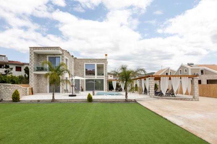 The construction incorporates modern, energy-efficient aluminum frames of the latest technology, while the pre-installation for a cooling-heating system ensures maximum efficiency and comfort. The outdoor area is designed for absolute relaxation and entertainment, with a 25 sq.m. swimming pool, stone pergolas that host a dining area and sun loungers, as well as a lush garden with trees and lawn. The large dimensions of the plot allow the creation of sports areas, such as a basketball or football field, a playground and relaxation corners.