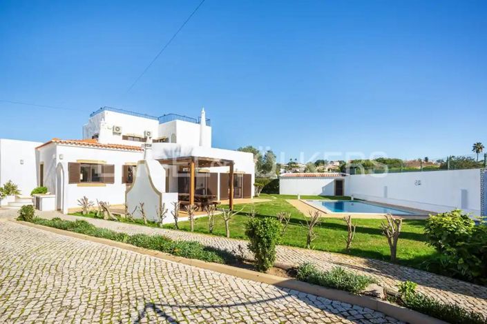 Fantastic villa, set on a plot of 1,073m2, located in a very quiet residential area 1.3 km from Galé. This well-maintained traditional-style villa consists of two floors. On the ground floor, there is the entrance hall with the staircase leading to the upper floor, a guest bathroom, a spacious and equipped kitchen, a dining area, a laundry room, and a pantry/storage room. This floor also features three large bedrooms, all with en-suite bathrooms and built-in wardrobes, as well as the living and dining room with a fireplace and direct access to the outdoor space.