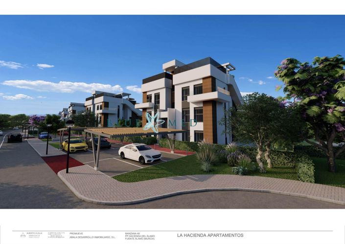 ~New apartments with parking space and storage room. Community pool and gardens.~Two bedrooms and two bathrooms (one ensuite). Living room with kitchenette.~Pre-installation of air conditioning.~Large balconies. Beautiful views.~~QUALITIES:~-Reinforced concrete foundation and structure.~-Foundation slab with perimeter lower drainage.~-One-way roof slab with solid slab on stairs.:~-Double-leaf façade enclosure made of ceramic factory, with interior chamber and thermal-acoustic insulation of 7 cm thick EPS.~-General exterior finish alternating layers of single-layer mortar and stoneware cladding.~-General interior plaster finish.~-Inverted flat roof waterproofed with adhered asphalt sheeting and~self-protected sheet reinforcements, insulated with 12 cm thick EPS insulation boards and~geotextile sheets below and above the insulation.~-In the walkable terrace area, non-slip porcelain stoneware floor finish.~-In non-trafficable areas, gravel finish:~-Interior division with 7 cm thick double hollow brick partition walls.~-Exterior flooring of accesses and garage, of printed reinforced concrete,~finished in colour and with relief of stone or cobblestone tiles, non-slip porcelain porch-terrace area~-Interior flooring of the house made of rectified porcelain stoneware, top quality,~placed on a floating screed of self-levelling mortar reinforced on 8 cm thick EPS thermal insulation.~-Smooth plastic paint on interior walls and ceilings that are not clad,~applied on plaster on walls and ceilings in all rooms,~except wet areas.~-In bathrooms, laundry room and kitchen, cladding of large-format rectified ceramic tiles,~fixed with adhesive mortar and sealing of joints with waterproof and flexible paste in colour.~-In bathrooms, kitchen and hallway, false ceiling made of laminated plasterboard mounted~on a metal profile structure.~-Main door of the house, made of thermo-lacquered aluminum profiles and~sheets with internal thermal insulation and thermal break. With 5-point lock with~security key.~-Windows with thermo-lacquered aluminum exterior carpentry, with thermal break~profiles.~-In bedrooms and doors leading to terraces, aluminum blinds and~internal insulation, housed in an EPS insulating box and with an~electric lifting mechanism.~-Glasses with double laminated glazing. Exterior sheet of 4+4 mm in spaces protected~with blinds and 6+6 mm in spaces without blinds, and interior sheet of~3+3 mm. With 14 mm dehydrated chamber and with low-emissivity thermal~sheet.~-Transparent laminated glass railing on terraces.~- Smooth interior doors, veneered in white lacquered MDF board,~with frame and trim made of sapelli wood or similar lacquered in white.~Matt stainless steel fittings.~- Complete cassette-type built-in wardrobes, made of melamine-veneered chipboard~with drawers, trunk shelf and bars for hangers.~Folding doors in satin polyurethane lacquered MDF board.~- White vitrified porcelain toilets and sinks, from the The Gap series~by Roca or similar. The sinks will be built into a suspended unit.~- Resin shower trays with non-slip stone relief tailored to the~space.~- Single-bowl stainless steel sink and drainer built into the~countertop.~- Thermostatic, single-lever chrome steel taps in showers.~-Plumbing installation with accumulator tank and individual pressure group, made with cross-linked polybutylene pipe, with shells for thermal insulation, with shut-off valves in each appliance and at the entrance to each wet room. Sockets for washing machine and dishwasher.~-Electric accumulator heater by aerothermal energy.~-Electrical installation according to Low Voltage regulations for high electrification level, with independent circuits for lighting sockets,~other general uses, hob and oven, washing machine, dishwasher, heater,~dryer, bathroom sockets, kitchen and bathroom sockets and air conditioning machine,~with top quality mechanisms.~-Telephone, TV, FM and audiovisual sockets in bedrooms and living room.~-Electronic video intercom.~-Pre-installation of air conditioning for cold and heat through ducts.~-Grilles and air supply diffusers made of white thermo-lacquered aluminum in~all rooms and kitchen. -Community pool and gardens for each phase.~CALL US NOW AT BLUE MED INVEST: 965595684~MIRAGOLF HDA