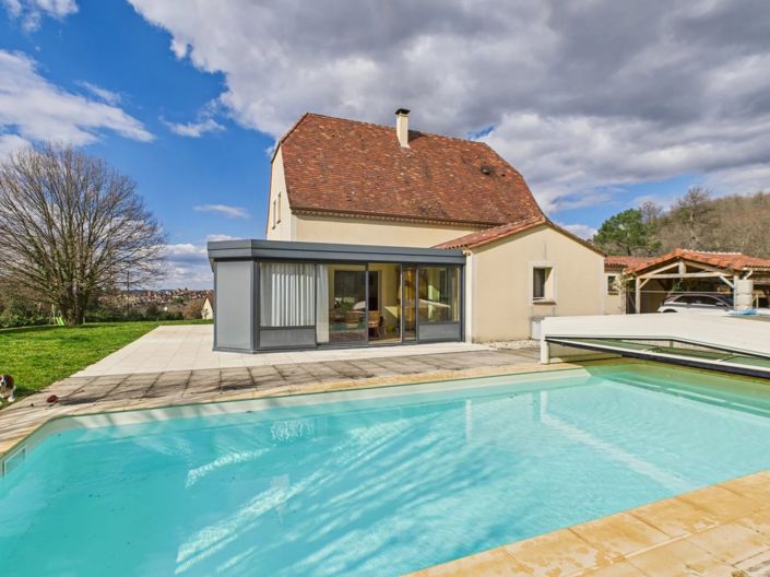 Outside, enjoy a covered swimming pool, secure garage, storage rooms, gardens, ample parking, and breathtaking panoramic views of Domme and the Dordogne countryside.