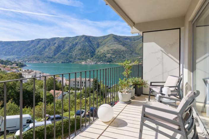 A two-bedroom apartment for sale in Dobrota, featuring stunning views of the Bay of Kotor. It is situated on the fourth floor of a residential building equipped with an elevator, reception, swimming pool, and gym (use of these facilities is available at an extra cost).