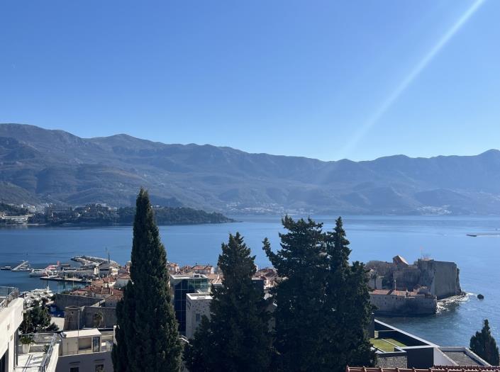 An apartment with two bedrooms is for sale, offering spectacular views of the Adriatic Sea and the Old Town of Budva.