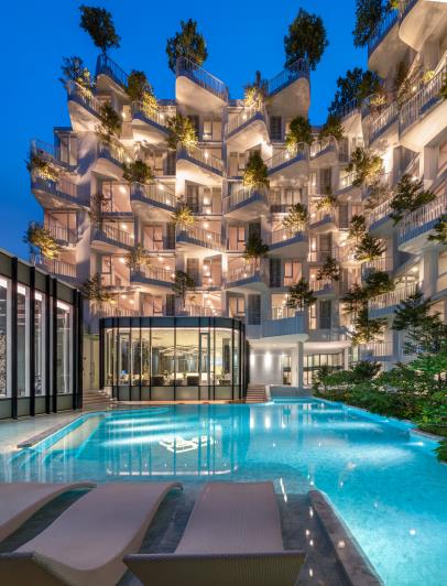 Enjoy a serene hideaway in Thonglor, where tranquility and greenery shield you from city noise. Chewathai Residence Thonglor blends peaceful atmosphere with modern green living. Amenities include a swimming pool, kids pool, jacuzzi, fitness center, steam room, garden, rooftop garden, putting green, parking area, and EV charger. The elegant design integrates modern architecture with nature, providing everything you need for city living.