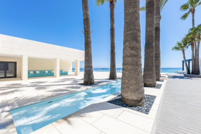 An extraordinary beachfront villa in the heart of the Mijas Costa, where contemporary design meets laid-back Mediterranean living. With direct beach access and uninterrupted sea views, this is coastal luxury on a whole new level. Set on a private 2,190m² plot, the villa offers over 560m² of built space and more than 700m² of terraces, all on a single level. Designed with clean lines and open-plan flow, the interiors are bathed in natural light thanks to full-height glass that blurs the line between inside and out. There are four spacious bedroom suites, each with its own en-suite bathroom and independent domotic control. The master suite is pure indulgence, complete with a sauna, jacuzzi, and unbeatable sea views. Additional features include guest toilets, a home office, staff quarters, and generous storage throughout.