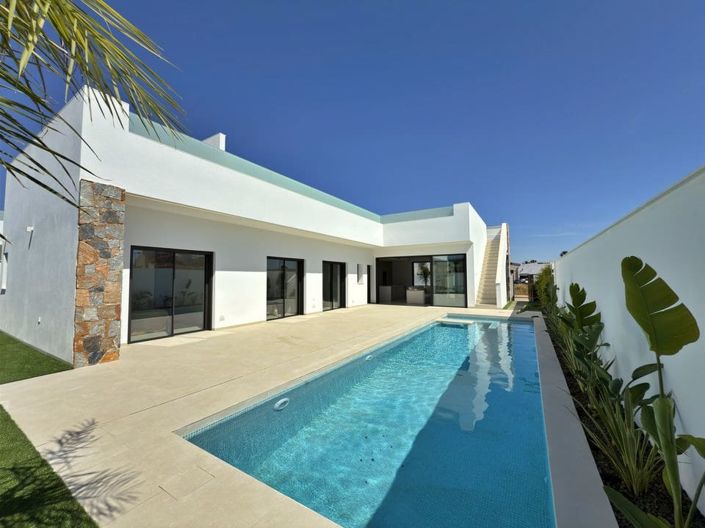 Modern villas has 3 bedrooms, 3 bathrooms, open plan kitchen with living area, terrace, solarium, private garden with the pool and parking space.