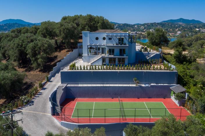 Outside, there’s a second pool with sunbeds, a barbecue area, and several terraces for relaxing or dining. A private tennis court, outdoor hot tub, and optional spa services complete the setting. Corfu Town, local beaches, restaurants, and shops are all just a short drive away.