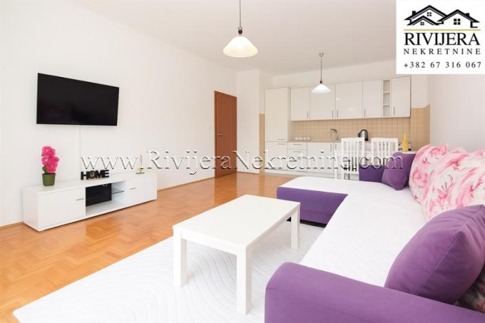 One-bedroom apartment with sea view Topla 2 Herceg Novi. The apartment has an area of 61m2, (58 m² + terrace 3 m²). The apartment is located on the first floor in a complex with a swimming pool and a children's playground. Layout: entrance hall with built-in wardrobes, living room and kitchen, bedroom, bathroom, and terrace with sea view. Private parking in front of the building included in the price. The apartment is fully furnished, all rooms are oriented towards the sea. Price €175,000