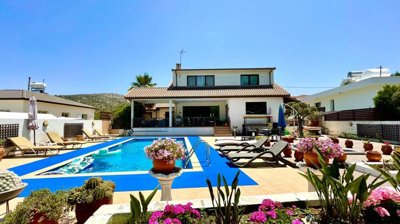 Situated in the beautiful village of Psevdas, proudly bring to the market this beautiful contemporary home. The house is built to very high specifications as is clearly visible throughout the home. The outside areas are ideal for entertaining and for enjoying a lovely lifestyle which residents of Cyprus enjoy throughout the year. With ample covered veranda areas, BBQ, decked areas with a built in hot tub, a very large pool and an outside shower and toilet area. The house also has an established garden, a double covered car port as well as a closed garage.