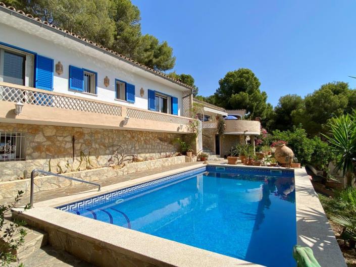 The property is situated on a spacious plot of 1,595 m² with beautiful views of the sea. The interior boasts a stylish, Mediterranean-inspired design and a warm, pleasant atmosphere. Two bedrooms, each with its own en-suite bathroom, offer comfort and privacy. The fully equipped kitchen impresses with its well thought-out layout and high-quality electrical appliances. The living room has an open fireplace, which not only creates a cozy atmosphere, but is also a visual highlight. The fittings are designed for year-round living comfort: Air conditioning, central oil heating and double-glazed PVC windows ensure a pleasant indoor climate all year round. A separate utility room, a spacious storage room and an additional cellar offer plenty of practical storage space. Outside, you will find a private pool area with an outdoor shower, a barbecue area for socializing outdoors and a well-tended garden with automatic irrigation. Various chill-out zones and atmospheric outdoor lighting complete the overall picture. The villa also has a closed garage and a covered parking space with automatic access gate. The boulevard of Paguera and the beaches of the town are within walking distance.