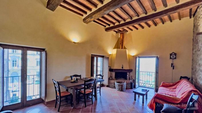Breathtaking views over Città della Pieve's rooftops and the countryside, fully renovated apartment in a historic palazzo is for sale, move-in ready. In the heart of Città della Pieve’s historic centre, this elegant residence captures the rare charm of a period home with sweeping views, refined restoration, and timeless character. Measuring approximately 100 square meters, the apartment has been thoughtfully renovated to blend rustic charm with modern comforts, featuring handcrafted terracotta floors, original wooden window frames, and interiors bathed in natural light. Located on the first floor of a historic palazzo, the home unfolds on a single level and includes a bright living room with a fireplace and three large windows framing breathtaking views over the Umbrian and Tuscan Valdichiana region. A sleek, modern kitchen adds a contemporary touch, while the spacious double bedroom—with its exposed stone wall—offers an atmosphere of quiet elegance. A stylish, well-appointed bathroom completes the layout. On the ground floor, a private storage space is currently used as a woodshed and utility room and adds further convenience. Just steps from charming cafés, artisan boutiques, and cultural landmarks, this residence offers a unique opportunity to embrace the slow-living elegance of Umbria, with all the ease of modern living. Ideal as a refined holiday retreat or a high-potential investment, in one of Italy’s most picturesque hilltowns. PROPERTY Ref: CDP3304Location: Città della Pieve, Province: Perugia, Region: UmbriaType: 103 sq m/1108 sq ft first floor apartment fully renovated + a 12 sq m/129 sq ft ground floor room for deposit useYear of construction: 1800Conditions: excellentLayout: First Floor: living room with fireplace, kitchen with pantry, hallway, corridor, 1 double bedroom, and 1 bathroom; Ground Floor: storage room and woodshed, shared entrance hallDistance from services: walking distanceDistance from main airports: Perugia 50 km, Firenze 110 km, Roma Ciampino 160 km, Roma Fiumicino 190 kmUtilities: Fixed telephone network: available; Internet: available broadband; Heating: methane; Water: mains city supply with softener; Electricity: available; Water waste: mains city connectionAnnual condominium costs: euro 120The property is owned by a private individual. The location, for privacy, is approximate. Please note all measurements cited are approximateEnergy Efficiency Rating: EApolloni & Blom RE conducts technical due diligence with the owner's technician to have a full report on each property's urban and cadastral state of the art. The due diligence may be requested by clients showing a strong interest in the property