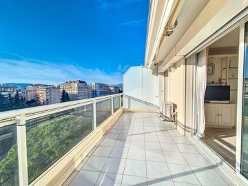 5 minutes walk from Rue d'Antibes and the famous Croisette beaches, on the top floor of a recent secured residence with swimming pool, very attractive 76.4 m² 2 bedrooms apartment comprising: living room and fitted kitchen opening onto a 15m² south-west-facing terrace, 2 bedrooms with fitted closets, bathroom with toilet, shower room, guest toilet. Very bright apartment, equipped with air conditioning and sold with a double garage. Rare in the city center!