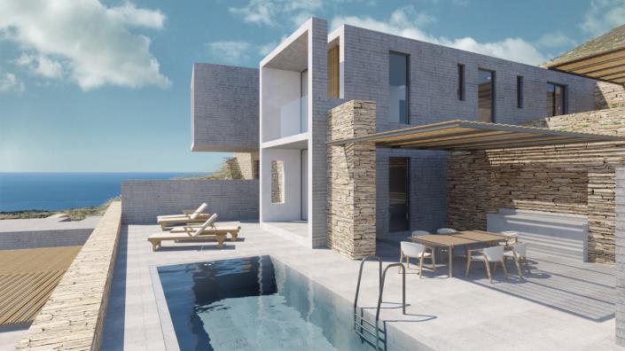 The estate comprises two villas of 100 m² each, featuring a modern open plan kitchen and living area that opens seamlessly onto the outdoor terrace and private swimming pool. Each villa includes two spacious bedrooms with en-suite bathrooms, combining comfort and privacy with elegant design. The third villa, with a total surface of 85 m², offers a similar open plan layout with a kitchen-living space, a guest WC, and two bedrooms, both with en-suite bathrooms. All rooms enjoy direct access to the outdoor areas, where each villa boasts a private pergola covered terrace and its own pool perfect for relaxing while taking in the breathtaking views.