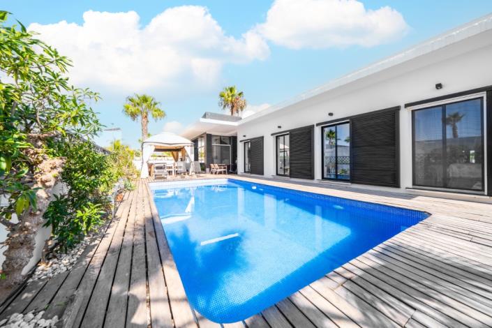 The home is filled with natural light, thanks to high ceilings in the spacious living room and large patio doors that provide direct access to the pool area from every room. Wood flooring runs throughout the property, adding warmth and elegance. The kitchen is fitted with a central island and modern finishes, ideal for both everyday use and entertaining. In addition a handy access door leads to the garden.