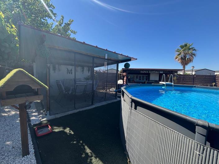 Outside: The exterior of this beautiful caravan is equally impressive. The 16m² front decking features stylish rattan furniture including two armchairs and two coffee tables, shaded by a Toldo. A stunning garden of 200m², completely refurbished in 2025, includes new slate and gravel landscaping, a 5m round swimming pool, pergola with mosquito nets (12m²), two sun loungers, a parasol, and an impressive solid wooden picnic table seating eight.