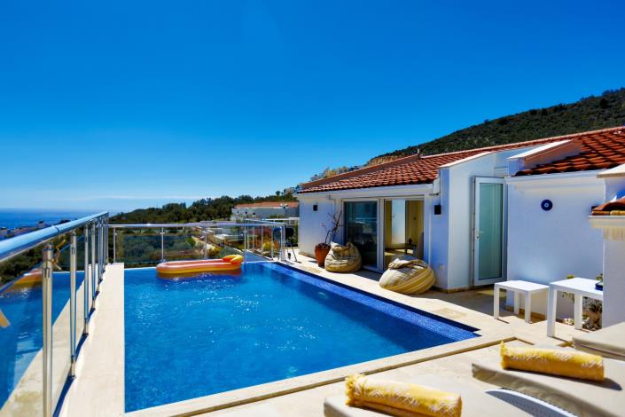 Outdoors, there is a wrap-around terrace, while the private rooftop plunge pool and sun terrace offer uninterrupted panoramas over Kalkan Bay and the surrounding olive groves.