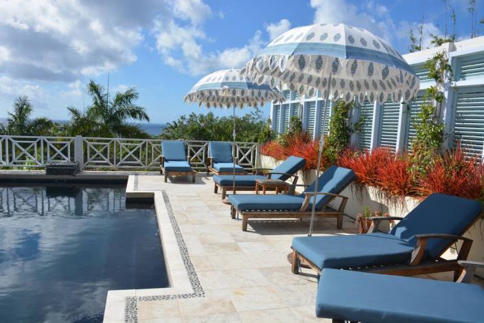 Large French doors open to a generous verandah overlooking a deep swimming pool, enclosed by a walled garden courtyard that feels like a hidden corner of Europe—perfect for relaxing afternoons or moonlit dinners.