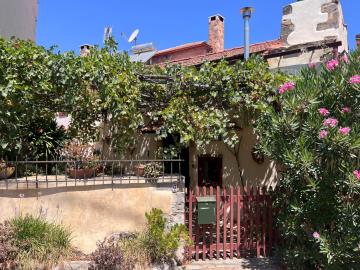 The main courtyard is shaded by an old grapevine and accented with stonework, perfect for outdoor dining and entertaining. The garden includes an original stone well, a storage room, and a separate utility area. A wooden deck at the back of the property offers sweeping views of Souda Bay and the surrounding village rooftops.
