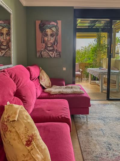 The apartment also boasts a covered pergola terrace on the lower level, offering shaded al fresco dining with views across the manicured gardens and inviting swimming pool. Inside, the property exudes quality with marble flooring throughout and bathrooms finished in floor-to-ceiling marble. The master suite includes built-in wardrobes and a luxury en-suite with walk-in shower, while the spacious lounge and dining area open onto a generous terrace with wonderful garden and pool outlooks.