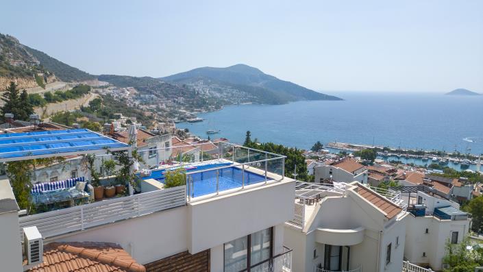 In the center of Kalkan, within walking distance to everywhere, not rented, specially furnished duplex apartment where the owner lives. 2 bedrooms are currently available, the other room is used as a study. One of the two bathrooms is in the master bedroom. Each room also has a balcony. Its special furniture and interior design have made the house quite comfortable and convenient to use. The kitchen and dining area, which meet the needs more than enough, are quite enjoyable. The kitchen is fully equipped and ready with all its equipment. There is a small storage area next to the kitchen, as well as a washing machine. There is also a large screen TV and full internet facilities in the large comfortable living room opening to the terrace. The living room and terrace have a sea view overlooking the entire Kalkan Bay. The terrace resembles a small garden equipped with potted plants. There is a dining area for 6 people and table chairs on the terrace. There is also a large terrace pool on the terrace. The pool is positioned in a way that overlooks the sea view as it is. There is its own open car park at the entrance from the road. There is also a separate jacuzzi belonging to the house in the entrance area. Our house is sold fully air-conditioned and fully furnished. Everything except the owner's personal belongings is included in the price.