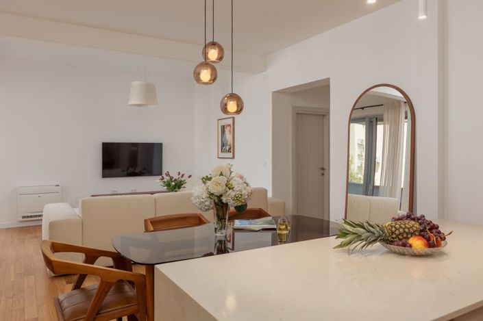 The apartment consists of a living room with a dining area and a kitchen that opens onto a unique spacious terrace with panoramic sea views, a master bedroom with an en suite bathroom, two smaller bedrooms and a bathroom.