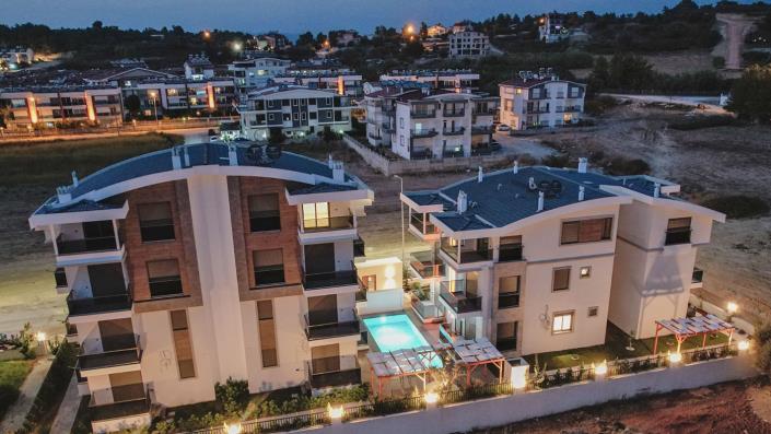 The complex occupies a 1,000 m2 and consists of two residential blocks: 4-storey A block with four 2+1 units and two 3+1 penthouses, and 3-storey B block with three 1+1 units and three 2+1 penthouses (11 apartments in total). The walled premises are under 24/7 video surveillance, the residence features a secure entry using a code, modern landscaping, a swimming pool with sunbathing areas, and satellite TV options.