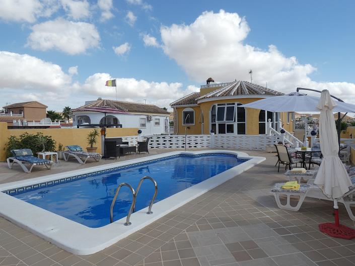 With tiled and decorative block raised walls to the exterior, this villa has great kerb appeal. Vehicle access is via double ornamental gates opening directly onto a paved driveway with space for multiple vehicles and access to the garage. To the left, the garden is planted with mature trees and bushes, with shale borders for easy maintenance extending to the rear of the villa.