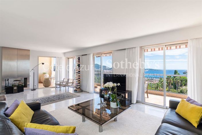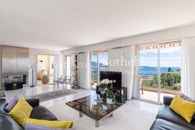 In a discreet residence in Fabron, this top-floor apartment extends over 155 m². It comprises a 50 m² living room, dining room, separate kitchen, two bedrooms, a third bedroom/office, two bathrooms, and a south/north facing interior patio. The apartment opens onto nearly 50 m² of terraces with panoramic views of the sea and the Bay of Angels.