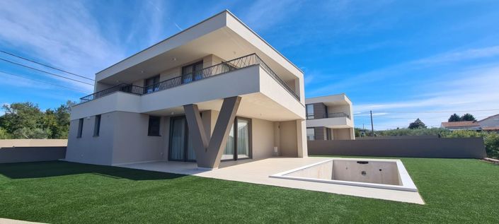 Modern villa of 212.99 m² located in Brzac on the island of Krk, set on a 565 m² plot and positioned approximately 1 km from the sea. The property is spread over two floors and offers a peaceful location with stunning views.The ground floor features a 38 m² open-concept living area, a guest bedroom with an en-suite bathroom, two storage rooms, a sauna, and a separate toilet. The living area opens onto a spacious 30 m² covered terrace, perfect for relaxing or entertaining outdoors.The upper floor, accessed via internal stairs, includes three additional bedrooms, all with access to a covered terrace offering panoramic views of the sea and the island of Cres. The master bedroom has its own walk-in wardrobe, a private bathroom, and an additional shared bathroom is also located on this floor.Construction and finishes have been completed using top-quality materials, including Porotherm brick with the STO façade system, full electric underfloor heating with Wi-Fi control, LG air conditioning units in every room and the living area, LED lighting, high-end Spanish ceramics by Cifre, large lift-and-slide PVC glass walls, and roof infrastructure ready for a photovoltaic solar system. The villa is being sold fully furnished and equipped.The landscaped garden includes a 21 m² swimming pool with a sun deck and shower, with pre-installation for heating via a heat pump. The exterior is fully finished, including landscaping, an automatic irrigation system, Semmelrock paving, and a remote-controlled gate. Two parking spaces are also included, each with preparation for electric vehicle charging.A key advantage of this property is its location. Set on the island’s tranquil southwest side, just a 5-minute drive from beautiful beaches, the villa offers magical Mediterranean sunsets and the quiet charm of nearby olive groves.Price: €870,000 (VAT included) Ref: RE-AB-MI-35Overall additional expenses borne by the Buyer of real estate in Croatia are around 7% of property cost in total, which includes: property transfer tax (3% of property value), agency/brokerage commission (3%+VAT on commission), advocate fee (cca 1%), notary fee, court registration fee and official certified translation expenses. Agency/brokerage agreement is signed prior to visiting properties.