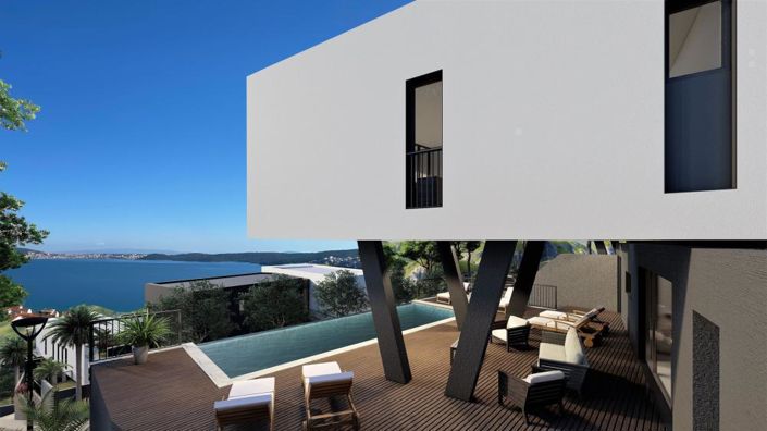 An attractive futuristic design property in a prestigious location only 300 meters from the beach in the tourist resort of Seget Donji, 5 km from the historic UNESCO town of Trogir.