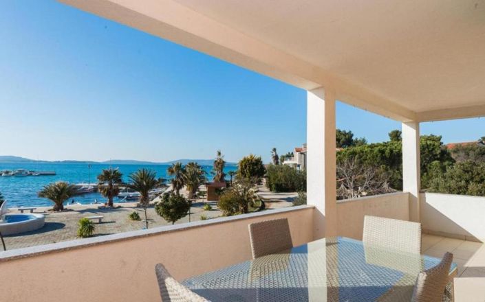 We offer a stunning beachfront property of 120 m2 in Šibenik-Žaboric, offering breathtaking sea views from its prime location on a spacious 1200 m2 land plot.This elegant, fully furnished home, built in 2011, spans two levels, with an apartment on each floor featuring identical layouts.