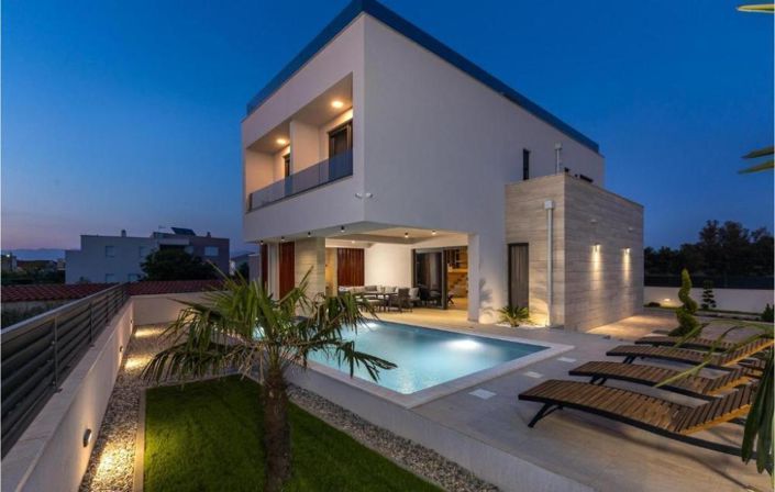 Magnificent new built villa in Zaton (Zadar area), mere 150 meters from the sea with all modern 5***** components!Constructed on a land plot of 466 m², the villa offers a net living space of 225 m², spanning three levels: the basement, ground floor, and first floor.