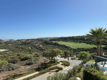 Designed with comfort in mind, the apartment features a spacious living area with wood flooring, a fully fitted modern kitchen, fitted wardrobes, and underfloor heating. Large windows fill the home with natural light, while the terrace provides panoramic views of the sea, mountains, golf course, and surrounding gardens.