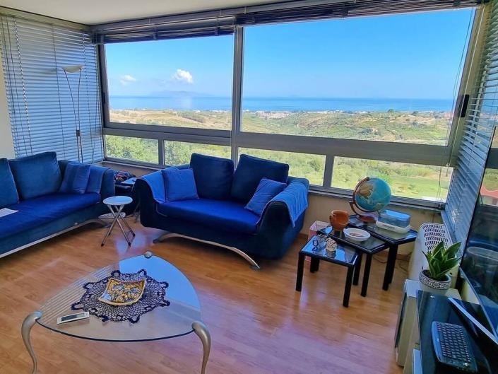 a spacious and bright open-plan kitchen and living area with a north-facing balcony that offers an unobstructed view of the lush Sicilian countryside and the blue sea and sky,