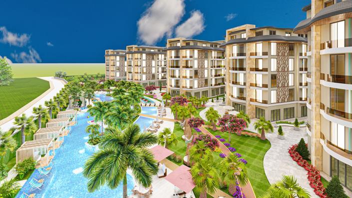The residential complex is situated on a 13000 m2 land plot and consists of 7 blocks with 252 units. This complex is equipped with modern features and provides a wide range of social facilities including open and closed swimming pools, a children's pool, indoor and outdoor jacuzzies, a sauna, a Turkish bath, a steam room, a salt room, a relaxing room, an open-air cinema salon, a fitness center, indoor and outdoor playgrounds for kids, a game room, a yoga area, a cafeteria, an underground car park, power generators, Wi-Fi at social areas, central satellite antennas, elevators, a shuttle service to the beach, camera surveillance, security service, and more.