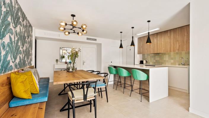 seamlessly into the sunny terrace and lounge. The apartment includes three bedrooms and two bathrooms.
