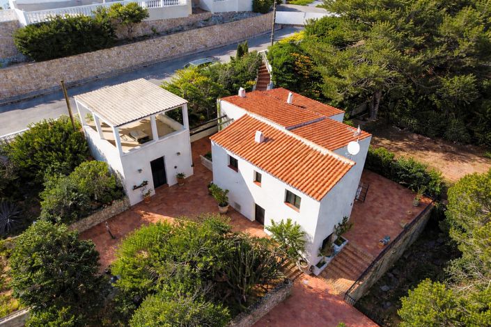 Upon arrival, a covered parking area provides immediate convenience. A short set of steps leads down to the main entrance, where an enclosed naya introduces the home and seamlessly flows into the living room. The kitchen is separate, offering practicality and the possibility to modernise to suit your lifestyle. This level includes two well-proportioned bedrooms and a full bathroom. Outdoors, the property features multiple versatile spaces currently used as storage rooms, ideal for conversion into a studio, workshop or additional accommodation. While the villa does not currently include a pool, the plot directly opposite also part of the property offers ample space to construct one, ensuring complete privacy. A selection of large terraces provides numerous areas for dining, entertaining or simply enjoying the sun. Although the property would benefit from renovation, this presents an exciting chance to stamp your own style and create a truly bespoke home.